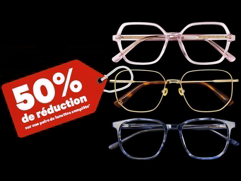 L’action « 50 % de réduction » est également valable à l’achat d’une paire de lunettes de soleil ou de vision nocturne complète avec correction, de lunettes multifocales, de lunettes de sport DRIIVE avec correction et de lunettes avec verres Workforce. Cette réduction s’applique aussi à toutes les options de verres. Vous bénéficiez d’une réduction de 40 % sur les lunettes complètes équipées de verres d’épaisseur standard (indice de 1,5). Non valable sur Ray-Ban Meta, les verres de marque, les verres de sécurité ou les lunettes déjà commandées. Cette offre n’est pas cumulable avec d’autres actions ou avantages.